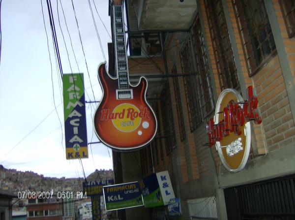 It was an interesting trip to La Paz today. It consisted of a bus change in Copacabana (Bolivia). We had to wait for about an hour or so till it arrived, so I walked around the town for a bit with Terra. It was a nice little place to be honest and may have been nice to stay for a night, but oh well. La Paz is pretty neat. It’s like a New York City inside a crater in a way. The city is surrounded by mountains and it’s a BIG city too. We had dinner at a Hard Rock Cafe here. We decided we had to go seeing how we weren’t expecting it. Things are definitely cheaper here which is good. I’m trying to see if I can get another internet loan but it’s not looking good at the moment. I’m unable to fax anything so I need one that just transfers money into my account. I think I can make it if I can get 300-400 more dollars. May have to ask for help from home. I need it within the next couple days if I am going on the bike trip down “The World’s Most Dangerous Road” which I really want to do. 16 more days until I fly back home. I need to not only get some more money but figure out my time in getting back towards Lima as well. I’ll figure it out somehow.