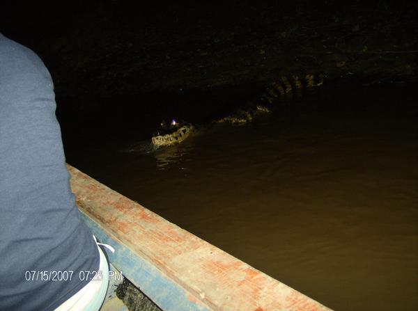 Currently relaxing in a hammock right now. It is pitch black and the moon looks like Cheshire Cat’s smile. Today on the pampas tour we walked through them in search of the elusive anaconda. A guide found a baby one but we couldn’t find a full grown. The guide on our trip is a fearless one. He actually found a cobra and caught it to show us. His name is Wilfredo. Later in the day we went back on the boat to find pink dolphins. On the way he pulled up to the shore by a lounging gator. He got out and walked to it. Talked to it.It slowly went away but he had a small fish he used to lure it back to him. He even petted it on the snout. I think he did it to make everyone at ease about swimming in the water and not to worry about the gators attacking us. I still didn’t go in. I don’t have a valid reason why. It wasn’t fear. I think it was more self consciousness of my body. Oh well. Also saw a beautiful sunset as we went to an ideal spot to view it. This tour has been a good way to wind down and come close to closing out this trip. Most definitely the highlight so far.